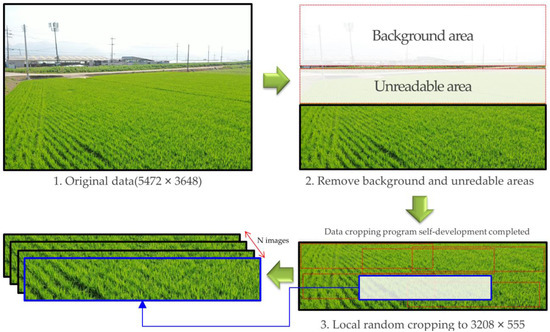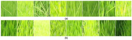 An example of image cropping RBD and normal rice plants: (a) Images in which the area containing rice infected with Bakanae disease is cropped, and (b) images in which an area containing normal rice is cropped.