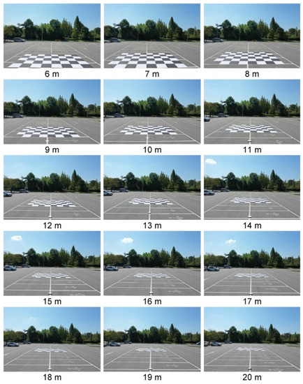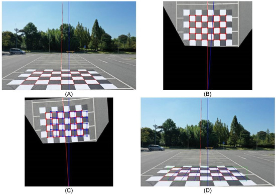 The perspective transformation for camera calibration: (A) reference lines and points for performing perspective transformations, (B) image projection from pixel coordinate to world coordinate, (C) center compensation based on the camera center point, (D) calculated recognition range using camera calibration.