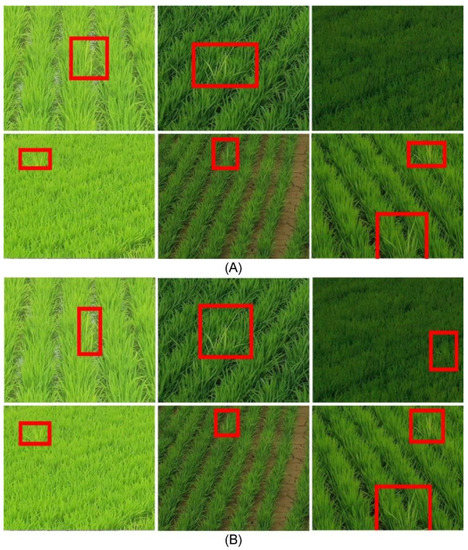 The detection results of RBD bunch area for patch segmentation data (Red boxes represent detected RBD-infected bunches): (A) warm up and label smoothing technique not applied, and (B) warmup and label smoothing techniques applied.
