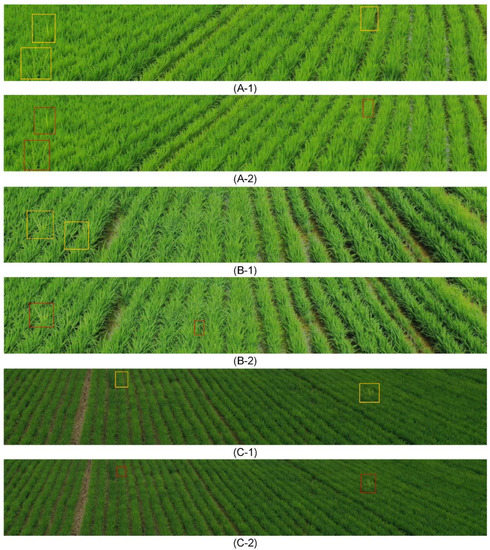 YOLOv3 model-based RBD bunch area detection results (Yellow boxes represent the ground truths, and red boxes represent the detection results): (A–C) Each detection task, (1) Ground truth, and (2) predicted result.