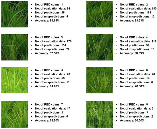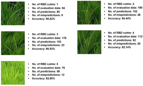 | Number of RBD Infected Culms | Test | True (Pred) | False (Pred) | Accuracy |