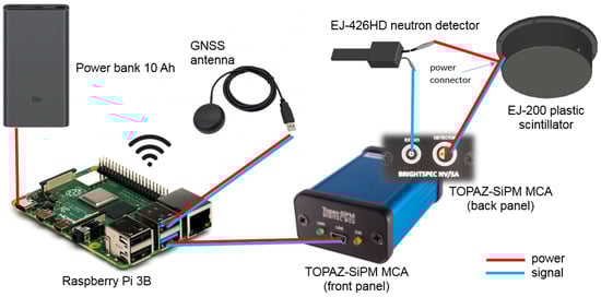 In order to obtain a standalone radiation detection system which could be easily integrated into any mobile platform or used as handheld equipment, we chose to use an independent power supply (power bank) and a global navigation satellite system (GNSS) antenna. The radiation detection system and associated electronics have a power consumption of approximately 2.75 W (550 mA current, 5 V). Using a power bank of 10 Ah, a battery life of up to 18 h was obtained.