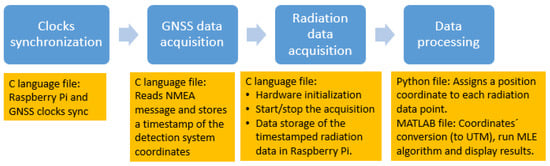 - Clocks synchronization. Before running the radiation data-acquisition code, it is necessary to synchronize the Raspberry Pi clock using the GNSS receiver clock [65];