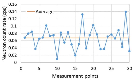For the EJ-200 scintillator, sampling times of 1 s, 2 s and 4 s were used for the handheld configuration, while for the detection system integrated in the drone, a sampling time of 1 s was used. In order to optimize the statistics of the neutron detection system measurements (results presented only for the drone configuration), larger integration times were chosen, which corresponded to the time spent carrying out the shipping container’s screening process: approximately 50 s for lateral wall screening and 120–140 s for a complete turn screening.