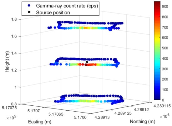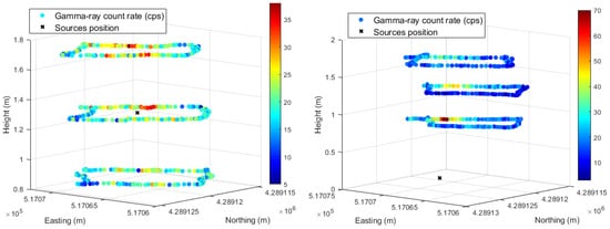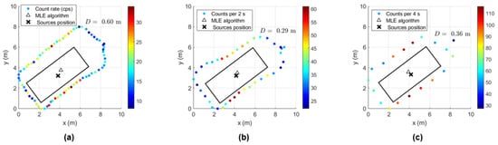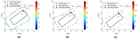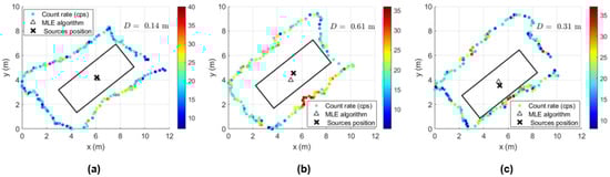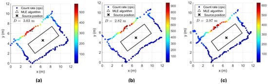 - For radioactive source localization, the Matlab program is used to read the CSV file and convert the latitude and longitude (in degrees) to universal transverse mercator (UTM) coordinates. In order to simplify the graphics, all “x” and “y” UTM coordinates are subtracted by their minimum “x” and “y” value, respectively, and therefore are presented in relative units. After that, all radiation intensity data points are processed by a MLE algorithm for a single source position estimation [42,66]. Finally, the distance between the true source position and the MLE estimated source position is calculated;