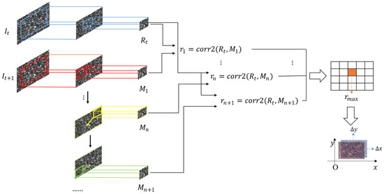 The calculation steps of DIC method are shown in Figure 2. Take two consecutive speckle images and . Calculate the correlation coefficient between two images. At the maximum correlation, the corresponding displacement is the relative displacement between two images.