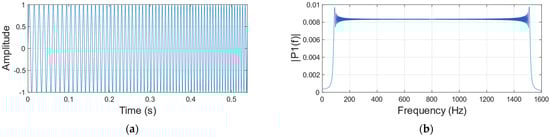 Reconstructed sinusoidal signal when a paper cup is the vibration object. (a) Time domain diagram. (b) Frequency domain diagram.