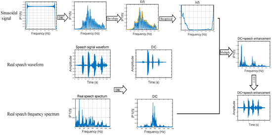 - Real speech domain: Multiply the discrete frequency domain sequence of the reconstructed real speech with the signal . The enhanced speech discrete frequency domain sequence is . According to the frequency range of speech, we process the speech with the frequency of 80–1400Hz.