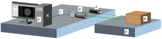 Experimental setup diagram. The laser beam generated by laser A is projected onto object M on the N platform. The change of speckle is collected by B camera, and these images are transmitted to the D computer through the C interface to extract the movement between speckle images.