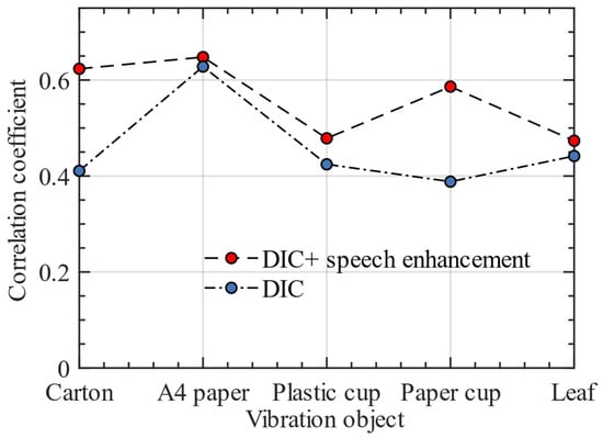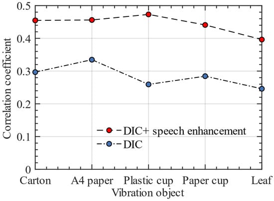 We recorded the changes of the frequency spectrum correlation coefficient between the reconstructed speech and the original speech after using the speech enhancement algorithm. We used the speech enhancement algorithm in this paper to process the sinusoidal datasets to verify whether the algorithm can increase the frequency spectrum correlation coefficient between the reconstructed sinusoidal signal and the original sinusoidal audio. Table 7 shows the sinusoidal signal reconstruction accuracy in detail. Figure 13 shows the line graph of the frequency spectrum correlation coefficient of reconstructed sinusoidal signal on different vibration objects. The existence of frequency response has a great impact on the reconstruction of sinusoidal signal, which will make the spectral correlation coefficient low. The sinusoidal signal dataset only verifies whether our proposed speech enhancement algorithm can reduce the frequency response; it cannot be verified whether the algorithm can also play a positive role in real speech. Therefore, the following experimental results are used to verify the enhancement effect of this algorithm on real speech.