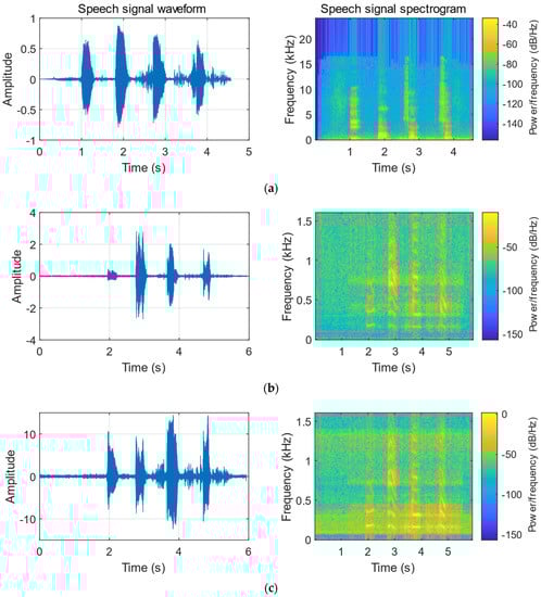 Comparison of speech signals reconstructed using the He-Ne Laser. (a) Original speech signal. (b) Speech signal reconstructed by DIC. (c) Speech signal reconstructed by DIC + speech enhancement.