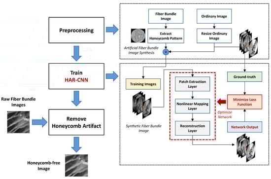 Workflow of HAR-CNN for honeycomb artifact removal in fiber bundle imaging.