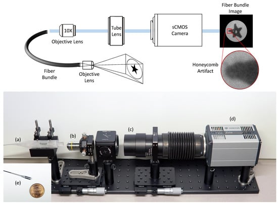 Hardware setup for the fiber bundle imaging system. (a) the proximal end of the fiber bundle, (b) objective lens (10×), (c) tube lens, (d) sCMOS camera, and (e) the distal end of the fiber bundle.