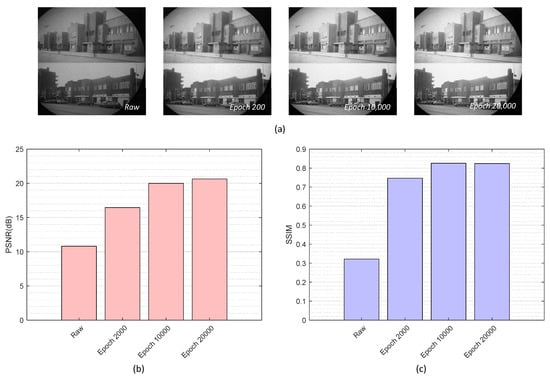 (a) Restored images for various training epochs, (b) PSNR according to the increment of training epoch, (c) SSIM according to the increment of training epoch.