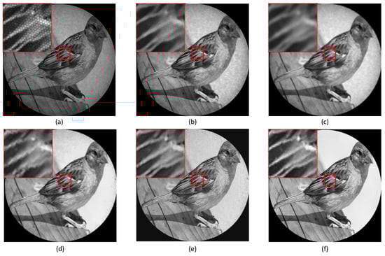 First, we examined image restoration performance of HAR-CNN along with the increment of training epochs—2000, 10,000, 20,000 using PSNR and SSIM. As shown in Figure 4, there was no significant improvement between 10,000 and 20,000 epochs in image restoration. The restoration performance of HAR-CNN was then compared with other conventional methods: median filter, Gaussian filter, and the interpolation method in []. The sizes of the applied filters were set to 7 × 7 and 3 × 3, for the median and Gaussian filters, respectively. Figure 5 shows qualitative results of honeycomb pattern removal on a synthetic fiber bundle image. It is found that HAR-CNN most preserves the detail of the image after restoration as shown in a magnified region of Figure 5e (see bird’s feather). In addition, we obtained the highest PSNR with HAR-CNN. It indicates that the proposed network was appropriately trained subject to minimizing MSE between output images and the corresponding ground truth. SSIM is also highest with HAR-CNN compared to the other methods. Interestingly, the median filter’s SSIM score is highest among the conventional methods while the interpolation method’s PSNR score is higher than that of the median filter. This is because the median filter could further preserve the sharpness of the edges compared to the other conventional methods. The quantitative results are summarized in Table 1.