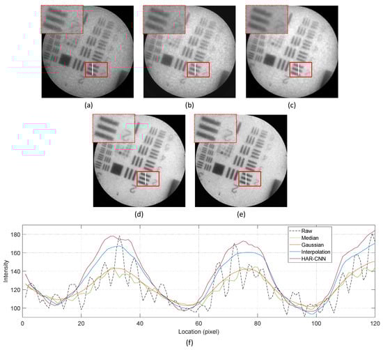 An inset figure at the top-left corner of each resulting image shows the magnified view of a cropped region with a red square in order to present restoration details. We also investigated the intensity values along a line of interest marked as a white line in the region. As a result, significant intensity modulations are observed in the raw image because of void imaging pixels as shown in Figure 6f. These wavy modulations become diminished as the filtering methods, interpolations, and the proposed HAR-CNN are applied. As shown in the magnified view, the edges of lines are clearly distinguishable with the interpolation method and HAR-CNN while those are still fuzzy with the median and Gaussian filtering because of a smoothing effect.