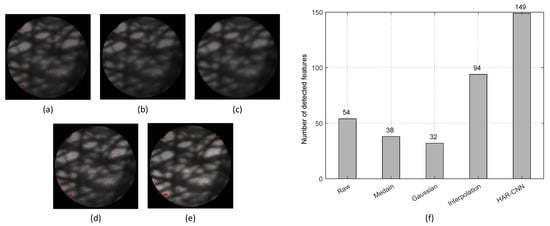 Detected image feature points for various honeycomb removal methods on the lens tissue sample: (a) raw fiber bundle image, (b) median filter, (c) Gaussian filter, (d) interpolation, and (e) HAR-CNN. The red cross indicates a detected image feature point. (f) The number of detected image features for the various honeycomb removal methods.