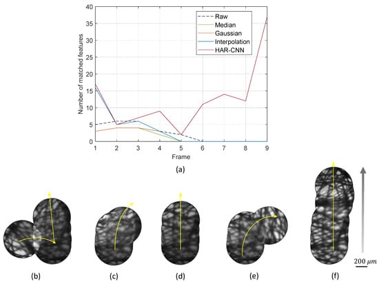 Image mosaicking performance was evaluated during a handheld scan of the fiber bundle probe along an upward direction for a length of approximately 1.7 mm. As a result, the proposed HAR-CNN yielded a vertically well-aligned mosaic image, since it provided a sufficient number of image features for accurate correspondence matching, as shown in Figure 9f. On the other hand, mosaicking results of the other methods were either fairly limited or distorted. For example, mosaic results by the median filtering and interpolation were distorted as is the result of the raw fiber bundle images due to spurious feature points. In the Gaussian filtering, the lack of extracted features impeded further image mosaicking although a well-aligned mosaic image was obtained only at the beginning of the scan.
