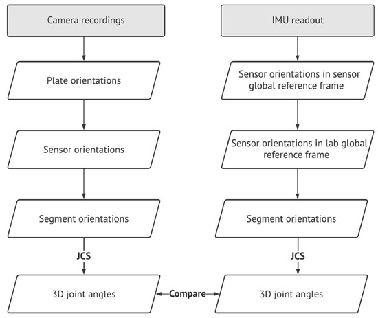 IMU readouts, including the tri-axial gyroscope, accelerometer, and magnetometer measurements, are used to obtain the sensor orientations using sensor fusion algorithms [30,31,32]. These orientations are usually subject to uncertainties and errors due to sensors’ biases and noises [32]. The sensor fusion algorithms address these uncertainties and help obtain a more accurate sensor orientation used for 3D joint angle estimation [31,32]. The 3D joint angles obtained in this study were estimated using the sensor fusion algorithm developed and presented in the Xsens software package (MT manager [27]). In this study, the IMU readouts were first filtered using a 4th-order low-pass Butterworth filter with a cut-off frequency of 15 Hz. Then, the sensor orientations (also known as IMU frames) were obtained in lab global reference frames using the retro-reflective markers fixed on the plates (plate orientations) and sensor-to-plate orientations obtained following the procedure suggested in [33,34,35] (Figure 2). Next, the segment orientations were calculated using the corrected sensor orientations of IMUs and sensor-to-body orientation obtained by sensor and segment frames obtained from the plate and anatomical markers [29], respectively, at the beginning of the capturing session [33,35]. Finally, using the obtained segment orientation, ankle, knee, and hip joint angles in the captured trials were calculated and expressed by the joint coordinate system (JCS) [36]. At the same time, the 3D joint angles were obtained using the markers placed on anatomical landmarks. The flowchart of the 3D joint angles calculation using IMU readouts and validation of the angles against those obtained by camera recordings as the reference system is shown in Figure 2.