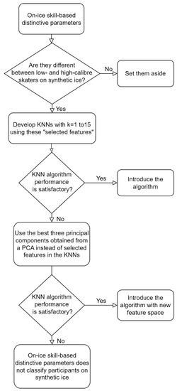 Alternatively, while preserving the essential information, a principal components analysis (PCA) was used to optimize the feature space dimensions used in the cross-validation analysis. The best three components obtained from the PCA on on-ice distinctive features were selected as the new feature space of the KNN classification, and steps (1–5) were repeated (Figure 3).