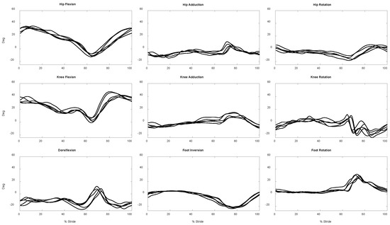 Exemplar 3D lower limb joint angles during five skating trials of a participant obtained from IMU readouts.