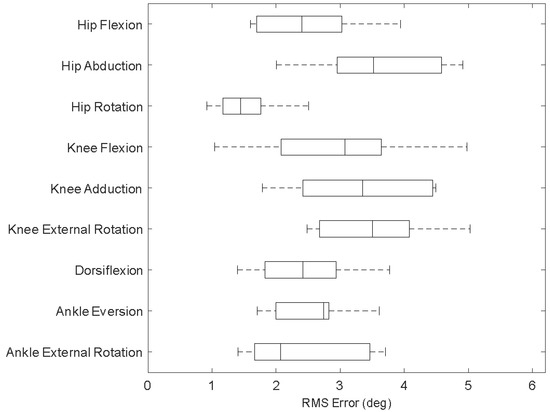 Root mean square (RMS) errors between the 3D angles obtained by IMUs readout and those obtained using camera recordings (as the reference system). First, the RMS error was attained between IMU-based and motion capture-based angles for each trial. Then, these values were averaged over all trials of each participant. Then, the RMS of all the participants’ obtained average values is presented as boxplots.