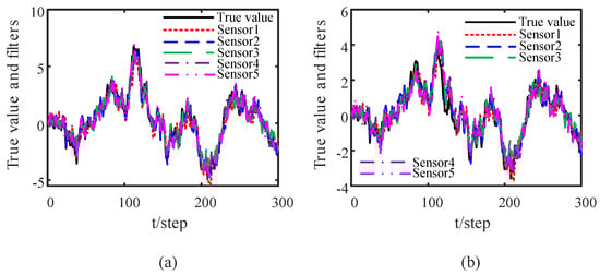 Tracking effects of DSTFCDs of five sensor nodes: (a) tracking for the position; (b) tracking for the velocity (authors’ own processing).
