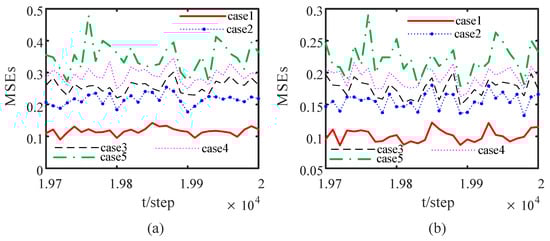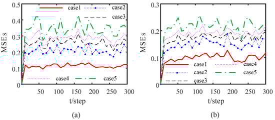 Figure 4 shows that the MSEs of the DOFCDs increase with the increase in the mean of the Bernoulli variables , ; i.e., the accuracy of the DOFCD in Case 1 outperforms that in Case 2, that in Case 2 outperforms that in Case 3, that in Case 3 outperforms that in Case 4, and that in Case 4 outperforms that in Case 5. Thus, the greater the attack probability of the attack signal corresponds to a worse accuracy of the DOFCD, which is reasonable.