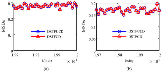 Comparison of MSDs of DSTFCDs and DSTFUCDs of five sensor nodes: (a) MSDs of the position filters; (b) MSDs of the velocity filters (authors’ own processing).