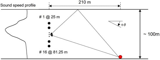 In May 2015, SAVEX15 was conducted in the northeastern ECS by using the research vessel Onnuri [22]. Figure 1 shows a schematic of the experiment with the sound–speed profile (SSP) measured from a conductivity, temperature, and depth (CTD) profile collected on JD 141 [22]. The bottom-moored vertical line array (VLA) comprised 16 elements, with an aperture of 56.25 m and an element spacing of 3.75 m (i.e., design frequency = 200 Hz), covering about half the water column (from 25–81 m) in approximately 100-m deep water. The acoustic transmissions were in various frequency bands covering 0.5–32 kHz and included both channel-probing waveforms and communication sequences. Throughout the experiment, highly impulsive noises produced by the snapping shrimps, which usually thrive at depths of less than 60 m [23], were unexpectedly received on large-aperture vertical arrays and dominated the soundscape [24,25]. Cracking sounds, known as snaps, have the most spectral energy at higher frequencies (>10 kHz) and are composed of two arrivals (i.e., direct and surface-reflected arrivals). When ambient noise data with no acoustic transmissions and only cracking sounds were analyzed, the dominant frequency band of the cracking sounds was found to be 11–24 kHz. At the lower-frequency bound (11 kHz) of the dominant frequency band, the element spacing corresponded to 27.5 wavelengths, rendering the array configuration extremely sparse. To verify the proposed algorithm, we used the snaps recorded during the experiment as well as the simulation data by using a 60-ms cosine-tapered linear frequency modulation chirp with the same frequency band (i.e., 11–24 kHz) as snaps. The source and VLA configurations, as well as the SSP shown in Figure 1, were utilized in the simulation, and the source was assumed to be on the seabed, comparable to the snapping shrimps [24].
