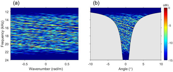 Figure 2a shows the f–k analysis of the simulation data. The slopes appear to be visible; however, overall, it is featureless to the extent that the angle cannot be estimated, although there were only two ray paths. This is because of the near field of the array as well as striation interference. Considering that the far field of the array is reached when is less than unity [28], the source will be in the near field because this parameter at 11 kHz (the lower frequency bound) is greater than 27 (i.e., ). If the source is in the near field, the slope related to the DOA in the f–k analysis inevitably spreads, and the influence of the spread is increased in the case of a sparse vertical array configuration. With , the x-axis was converted from a wavenumber to a physically detectable angle, as shown in Figure 2b. Recalling that the angle range that the array can detect by using Equation (8) decreases when the frequency of the signal is higher than the design frequency, the angle range becomes extremely narrow for an extremely sparse vertical array configuration, as discussed in Section 2. The gray-shaded region represents the regions that are not physically detectable, and, when the design frequency is 200 Hz, the detectable angle range of the array at 24 kHz is within . Figure 2b, similar to Figure 2a, is featureless, as if the pattern of striations is random. Hence, the DOA cannot be corrected by using periodicity.