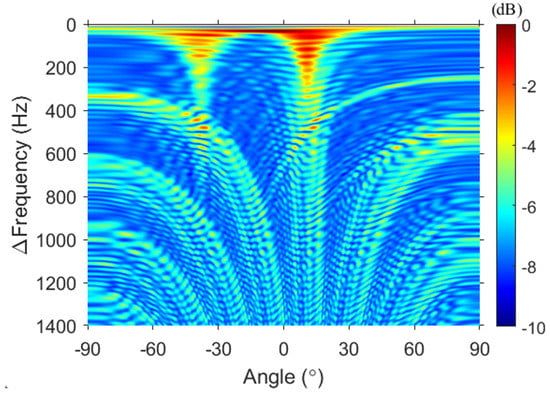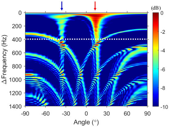 First, FD beamforming was applied to the same simulation (see Figure 3). To minimize the number of cross terms generated due to the multipath, the output of FD beamforming was incoherently averaged over 11 kHz 22.6 kHz with 10-Hz intervals. The y-axis in Figure 3 indicates the difference frequency. To confirm the trend of an increasing difference frequency, the difference frequencies, which are user-chosen parameters, were set from 0 Hz to 1400 Hz with 1-Hz intervals. This is comparable to simulating a signal with a frequency band of 0–1400 Hz. The arrows in Figure 3 represent the DOAs calculated by using the image method based on the center of the VLA as the reference angles. The red and blue arrows correspond to the direct (12.6) and surface-reflected (−36.1) paths, respectively.