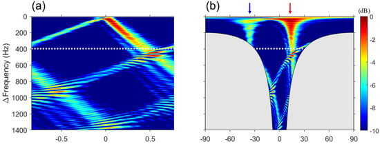 –k analysis of the simulated data. (a) Difference frequency–wavenumber domain and (b) difference frequency–angle domain. The output of the –k analysis is averaged similarly to that of FD beamforming. The –k analysis and Figure 3 are identical, except for the gray-shaded region. Compared with the featureless f–k analysis, the –k analysis clearly exhibits two lines. Considering the range between the source and VLA and aperture of the VLA, the maximum limit frequency of the far field of the array (white dotted line) is 400 Hz. Angle spread can occur because of the near-field effect on difference frequencies higher than the maximum limit frequency, as shown in (a,b).