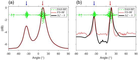 Except for the gray-shaded region, Figure 3 and Figure 4b are identical. This relationship is consistent with that described in Sec. Section 2 between the f–k analysis and DAS beamforming and is corroborated by Figure 5. Additional averaging (i.e., double averaging) in the range of difference frequencies can improve the robustness of DOA estimation [11,12,19,20]. Figure 5 shows a comparison between DAS beamforming, the results of double averaging from the –k analysis and FD beamforming. Averaging for was performed with 1-Hz intervals, excluding the gray-shaded regions. The green dashed line represents DAS beamforming, whereas the black solid line and the red dotted line represent the double averaging outputs of the –k analysis and FD beamforming, respectively. All the results are normalized to the peak value. First, Figure 5a shows the results of double averaging within the difference frequency band lower than the design frequency as well as the result of DAS beamforming.. Two large pulses are detected in DAS beamforming. However, the exact angle could not be calculated because of oscillations within each pulse due to the sparseness of the array. By contrast, double averaging of the –k analysis and FD beamforming provided consistent results at all angles, with two distinct angles (direct: 13.8, surface-reflected: −36), demonstrating consistency between Figure 3 and Figure 4b. Compared with the reference angles, the maximum error of the angle estimated in Figure 5a is approximately 1, indicating that the angle is successfully estimated.