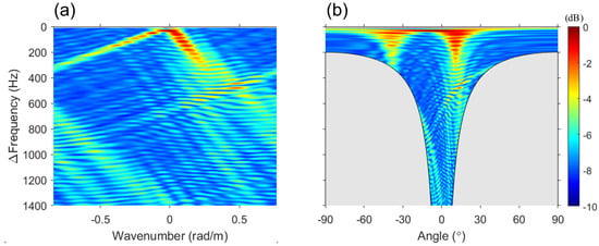Figure 8 shows the output of the –k analysis as the counterpart of the experimental results in Figure 4. The experimental data were comparable to the simulation results, as expected from the FD beamforming output. Furthermore, the angle spread and decay caused by the abovementioned array shape were more clearly highlighted by the angle-related slope in the –k domain (see Figure 8a). Despite the addition of background noise and the influence of the array shape compared with the simulation, the two main lines can still be clearly identified in Figure 8.