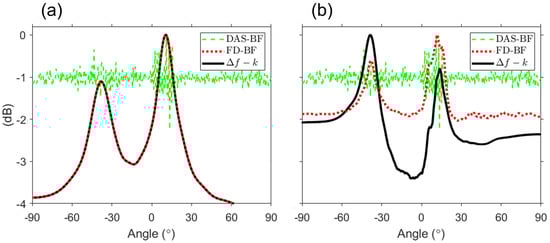 For simulation data, comparison of the –k analysis (black solid line) with FD beamforming (red dotted line) double averaged over 0 (a) 200 Hz (design frequency) or (b) 1400 Hz with DAS beamforming (green dashed line). For double averaging, the interval is 1 Hz, and the gray-shaded region in Figure 4 is excluded. Along with FD beamforming, the –k analysis has the ability to estimate any angle within the design frequency. By contrast, the sidelobes of the –k analysis are lower than those of FD beamforming when averaging over all difference-frequency bands, because the grating lobes of FD beamforming have the same function as adding background noise.