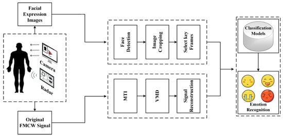 Wireless sensing technology realizes the target’s sensing task by analyzing the target’s influence on the surrounding wireless signals. Compared to traditional sensing techniques, its features of not requiring the target to wear any sensor, non-line of sight propagation, and privacy protection have made it an ideal solution for sensing tasks in many fields, such as intrusion detection [4], gesture recognition [5], physiological detection [6] and indoor positioning [7]. As wireless sensing tasks expand from coarse-grained to fine-grained, traditional technologies such as ZigBee, CSI, and CW signals can no longer meet the current sensing needs, and millimetre-wave radar has received widespread attention due to its larger bandwidth, more sensitive distance resolution, and higher Doppler frequency. Millimeter wave radar has achieved remarkable results in theoretical research [8] and practical application of fine-grained perception [9,10], which also provides ideas for us to realize the task of contactless emotion recognition.