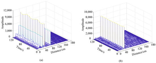 Radar echo signals before and after MTI processing static clutter: (a) Raw echo signal of millimeter wave radar. (b) The echo signal after MTI processing.