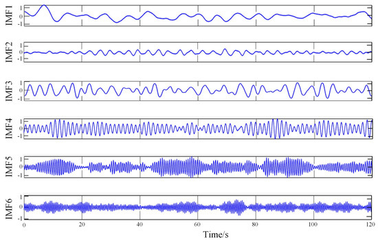 When determining the k value, when the central frequency of each IMF component remains stable at different k values, it indicates that the original physiological data is not over-decomposed. When the frequency ratio of adjacent centers is greater than 90%, it indicates that the original physiological data is over-decomposed, and a faulty component is obtained by over-decomposition in the IMF component. In this paper, all IMF is stable when k is not less than 6, which also means that signal decomposition is completed when k is not more than 6. In addition, when k = 7, the central frequency of adjacent IMF is greater than 90%, the decomposition is excessive, so k = 6 is finally determined. A group of results obtained by the VMD algorithm is shown in Figure 3.