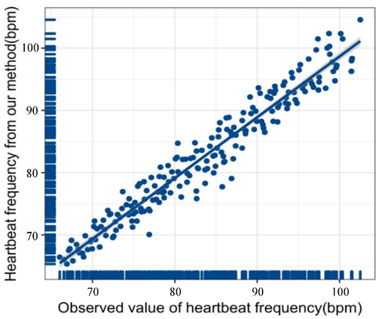 The obtained heartbeat signal is subjected to Fourier transform to obtain the heartbeat frequency. We collected two hundred sets of heartbeat data by allowing the subjects to wear the MI5 smartwatch to participate in the experiment. The heartbeat frequency observation value of the MI5 smartwatch and the heartbeat frequency obtained by the proposed method is used for linear regression modeling. Figure 6 shows the proposed method’s overall fitting degree (). The closer the score of is to 1, the closer the fitted curve is to the actual curve. The score of the proposed method is 0.94, which also shows that the accuracy and reliability of the heartbeat signal obtained in this paper are excellent.