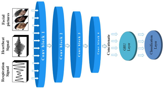 Based on the emotional data of different dimensions obtained by the above method, this paper proposes a deep learning model, as shown in Figure 7. The data obtained are passed through four convolution modules with similar structures. The dimension of the data determines the specific parameters of each module. The data of three channels with different dimensions can obtain richer feature information. After that, the obtained feature elements are spliced in parallel as the input of the GRU neural network. Then the emotion recognition is realized by the dense layer with the softmax activation function as the classification function.