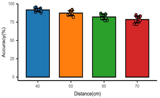 In addition, the distance between the device and the subject is also an essential factor affecting the recognition accuracy because of the short wavelength of the millimeter wave, the characteristics of easy attenuation, and the video image taken by the camera will also decrease as the distance increases. Therefore, we adjusted the distance between the millimeter wave radar and the subjects in the experiment and collected the experimental data of 10 subjects at the distance of 40 cm, 50 cm, 60 cm, and 70 cm, respectively. Figure 10 shows the recognition accuracy of four emotions at different distances. It can be seen that the average recognition accuracy of the four emotions gradually decreases with the increase in distance.