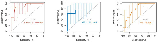 In this paper, CNN and GRU deep learning models are used in the emotion recognition task according to the characteristics of different modalities. Then the classification ability of ER-MiCG needs to be validated compared to these two classification models. In addition, the intensity of a specific emotion induced by audiovisual stimuli is highly subjective, which increases the difficulty of completing the classification task only under commonalities. Therefore, it is crucial to validate the classification ability of the proposed classification model ER-CG in this paper. We compare ER-MiCG with CNN and GRU deep learning models. The receiver operating characteristic curve (ROC curve) is commonly used to evaluate the classification ability of the model. The horizontal coordinate X-axis is 1 − specificity, also known as the false positive rate (false alarm rate), and the closer the X-axis is to zero, the higher the accuracy rate; the vertical coordinate Y-axis is called sensitivity, also known as the true positive rate, and the larger the Y-axis represents the better the accuracy rate. According to the curve position, the whole graph was divided into two parts. The area of the part under the curve is called AUC (Area Under Curve), which is used to indicate prediction accuracy. The higher the AUC value, the larger the area under the curve and the higher the prediction accuracy. Figure 12 shows that the AUC scores in the ROC curves of the three models are in descending order: ER-MiCG > GRU > CNN, which also indicates that ER-MiCG has a higher classification ability.
