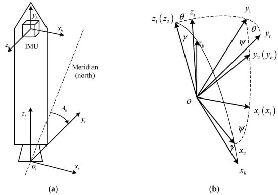 Launch CS and IMU CS of LV [26]. (a) Launch CS and IMU CS; (b) Euler angle definition.