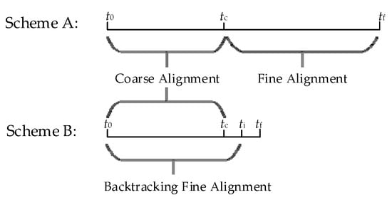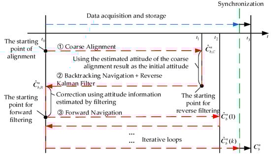 To improve the alignment performance by taking full advantage of all sensor data in a limited amount of time [17,18,19], a real-time information-reusing alignment strategy was proposed for rotating an inertial navigation system in Reference [20]. Li et al. [21] designed a backtracking navigation scheme for INS (Inertial Navigation System)/DVL (Doppler Velocity Log) integration. Yan et al. [22] proposed an inter-travel alignment scheme based on reverse data processing, which organically combined the initial alignment of the moving base with the position navigation through the reverse navigation algorithm, which first carried out the initial alignment of the moving base attitude and the sensor sampling data storage of the SINS (Strapdown Inertial Navigation System) gyrocompass and then used the reverse and forward dead reckoning algorithms to obtain the position information, which solved the previous problem that the position needed to be corrected using landmark points after inter-travel alignment. Liang et al. [23] applied the reverse navigation algorithm to the static base alignment of the SINS, which effectively shortened the alignment time and improved the alignment accuracy. Wang et al. [24] introduced the reverse Kalman filtering technique, which processed the collected historical data several times using the forward and reverse Kalman filtering algorithms and completed the reverse fine alignment and forward combined navigation on the basis of the coarse alignment results. In Reference [25], aiming at the problem of long alignment time for traditional methods, a forward-forward backtracking initial alignment method under swaying base conditions was proposed to achieve the purpose of rapid initial alignment, which did not consider linear vibration.
