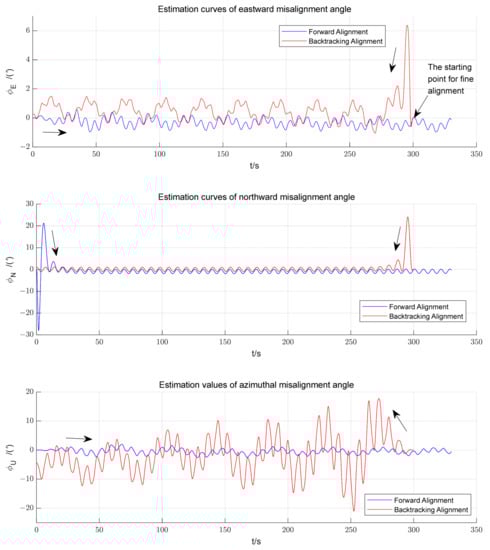 Using the strategy proposed in this paper, a stochastic simulation was performed. Figure 6 shows the estimated curves of the misalignment angles during the first backtracking navigation FA and the first forward navigation FA. The arrow in Figure 6 indicates the estimated direction.