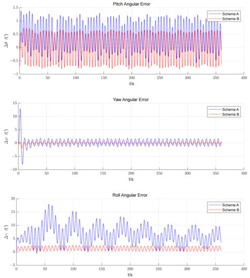 Three-axis attitude error curves for the FA of scheme A and the last FA of scheme B.