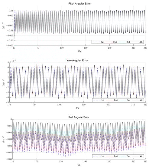 Under the above simulation conditions, four of the reverse processes were selected and the alignment error curves are shown in Figure 8. Clearly, the orientation attitude angle is continuously corrected as the number of reversals increases.