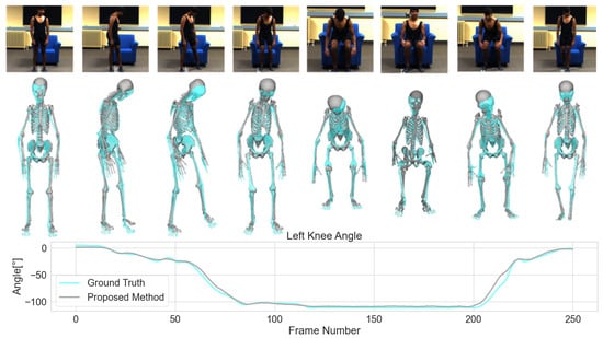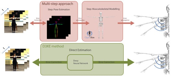 For example, Kidzinski et al. [1] used OpenPose to first predict key points from a video and then trained a convolutional neural network (CNN) to predict the walking parameters of patients with cerebral palsy. Liao et al. [6] first model the 2D pose in OpenPose then create a 3D pose using data-driven matching and finally estimate 3D gait parameters. Noteboom et al. [7] first used VideoPose3D [15] to estimate a 3D pose, followed by modeling in OpenSim [16] for the estimation of dynamics from a single camera. Pagnon et al. [2,3] developed the handy Pose2Sim tool, which first combines 2D OpenPose pose estimations from multiple cameras into a 3D pose then models it in OpenSim. Because the pose estimation step is de-coupled from kinematic estimation, errors in pose estimation propagate through to the estimation of kinematics. Uchida and Seth [17] showed that 20 of marker uncertainty leads to a variation of 15.9 in peak ankle plantarflexion angle and impacts downstream tasks such as joint moment estimation. Della Croce et al. [18] showed precision variation 13 mm to 25 mm, which leads to differences in estimated joint angles up to 10. Fonseca et al. [19] showed that misplacement of markers up to 10 can lead to errors of 7 depending on the marker. With estimation errors of 30 mm to 50 mm in keypoint estimation [11], it is to be expected that these errors will substantially influence kinematic estimation from markerless motion capture. Low-pass filter [2,20] or bi-directional Kalman-filter [20] has been applied to compensate for noisy key point estimations, but cannot correct for faults in keypoint detection. Subsequent modeling and kinematic calculation steps can only compensate for these inaccuracies. This ‘multi-step’ approach is probably inspired by the steps of a traditional OMC method, as in the traditional OMC systems the pose detection step is done using a different system and is thus isolated from the other steps. In camera-based kinematic estimation pipelines, however, the de-coupling of individual steps is no longer necessary.