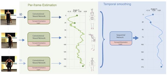 To fine-tune the per-frame predicted joint angles and scaling parameters we add a sequential network. Sequential networks are used in pose estimation to ‘lift’ an estimated 2D pose to 3D [30,31]. Recent research combines temporal information with lifting to improve accuracy during frames where one limb occludes another in the view of the camera (self-occlusion) or where not all key points were detected [15,32,33]. In contrast to CNNs, these sequential networks do not take a single frame as input but exploit temporal dependencies in the data for their prediction. As the convolutional network outputs per-frame estimates, it cannot take temporal information into account. We add a sequential network to our architecture to refine a sequence of estimations made by the convolutional model. Inspired by works on temporal lifting we experimentally evaluate three sequential networks; an LSTM [34], a Temporal Convolutional Network (TCN) [15] and a Transformer [33] to refine the predicted joint angles and scale factors.